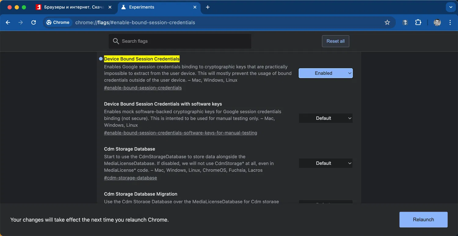 chrome://flags/#enable-bound-session-credentials - Измените статус флага на Enabled.
