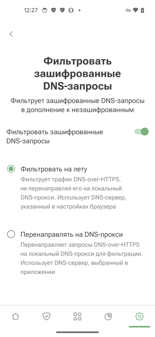 Благодаря обновленному движку фильтрации CoreLibs, в мобильных устройствах появилась возможность фильтрации запросов DNS-over-HTTPS (DoH) «на лету». Ранее, при настройке DoH в браузере, запросы перенаправлялись на нешифрованный системный DNS-сервер. Теперь AdGuard фильтрует такие запросы сразу, минуя нешифрованные сервера и отправляя их непосредственно на целевой сервер. Новую функцию можно найти в настройках: «Настройки > Основные > Расширенные > Низкоуровневые настройки > Фильтровать зашифрованные DNS-запросы».