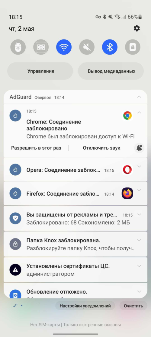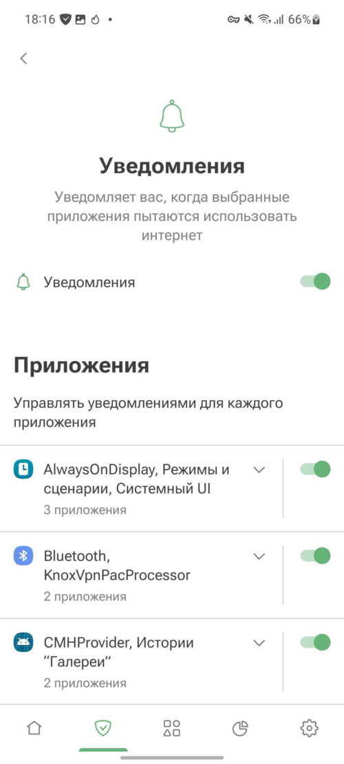 В ответ на это разработчики добавили возможность гибкой настройки уведомлений. Теперь можно отключать уведомления фаервола как для всех приложений сразу, так и для каждого отдельно. Например, если слишком часто появляются уведомления о том, что Chrome использует интернет, их можно отключить непосредственно из панели уведомлений, нажав кнопку «Отключить звук». Кроме того, настроить уведомления можно в разделе: «Защита > Фаервол > Уведомления», выбрав необходимое приложение.