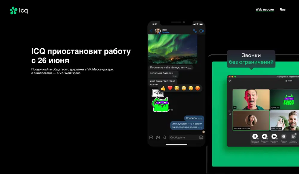 Компания рекомендует пользователям ICQ сохранить свои данные, переписку и файлы на компьютере, а также переходить на использование «VK Мессенджера». В сообщении на сайте ICQ указано, что сервис завершит свою работу 26 июня, и что сотрудники ICQ присоединятся к командам других проектов VK.