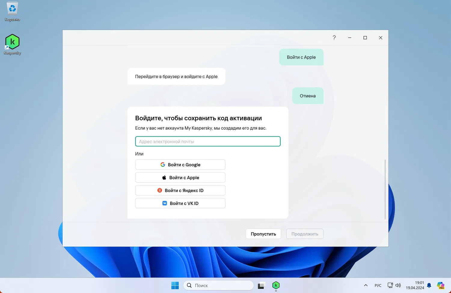 - Вход в My Kaspersky через социальные сети. Добавлена возможность авторизации через VK и Яндекс, что упрощает доступ к учетной записи.