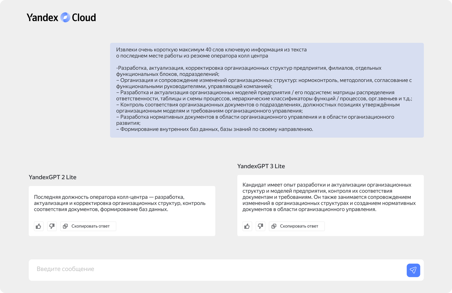 YandexGPT 3 Lite можно интегрировать в свои продукты через API в сервисе Foundation Models. Новая модель заменит предыдущую в течение месяца, но уже доступна для тестирования. Стоимость использования YandexGPT 3 Lite составляет 20 копеек за тысячу токенов. Новые пользователи Yandex Cloud смогут бесплатно протестировать её в демо-режиме.