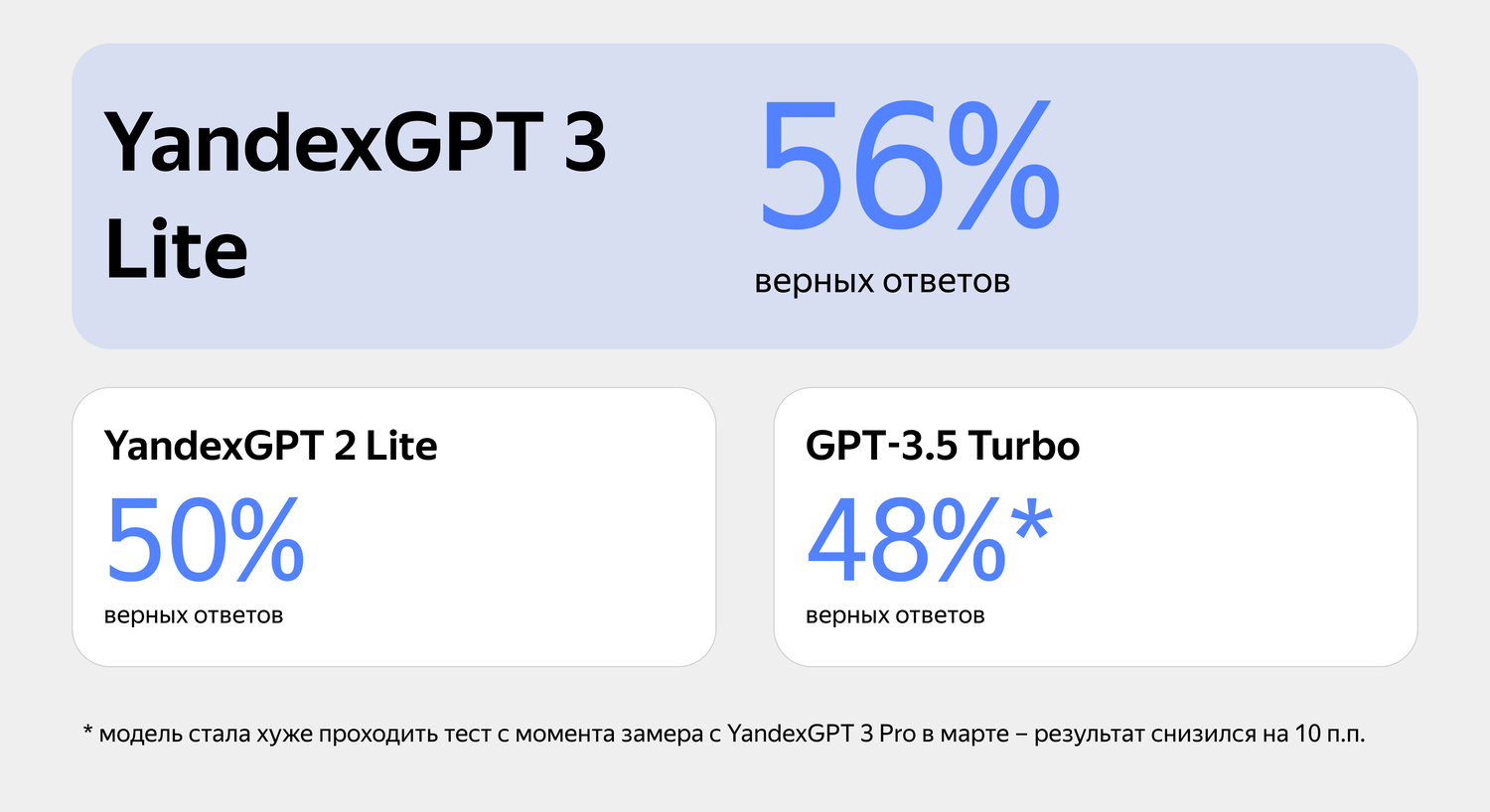 Новая модель значительно превосходит YandexGPT 2 Lite. В тестах YaMMLU_ru, новой модели удалось дать на 6 процентных пунктов больше правильных ответов по сравнению с предыдущим поколением. В тестах Side by Side эксперты в 68% случаев предпочли ответы YandexGPT 3 Lite.