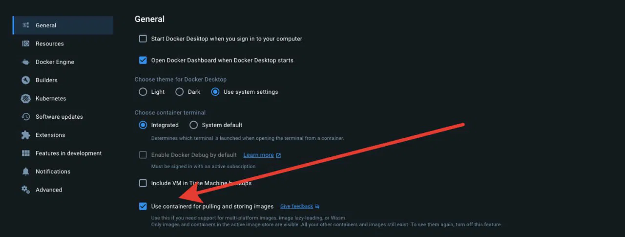 - Убедитесь, что в настройках Docker включена поддержка containerd: