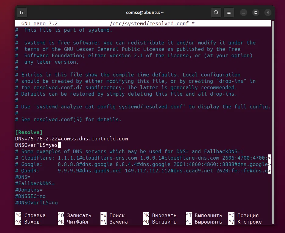 В качестве ручной, самостоятельной, установки и настройки Comss.one DNS вы можете воспользоваться службой systemd-resolved, которая поддерживает протокол DNS-Over-TLS. Выполните следующие команды: