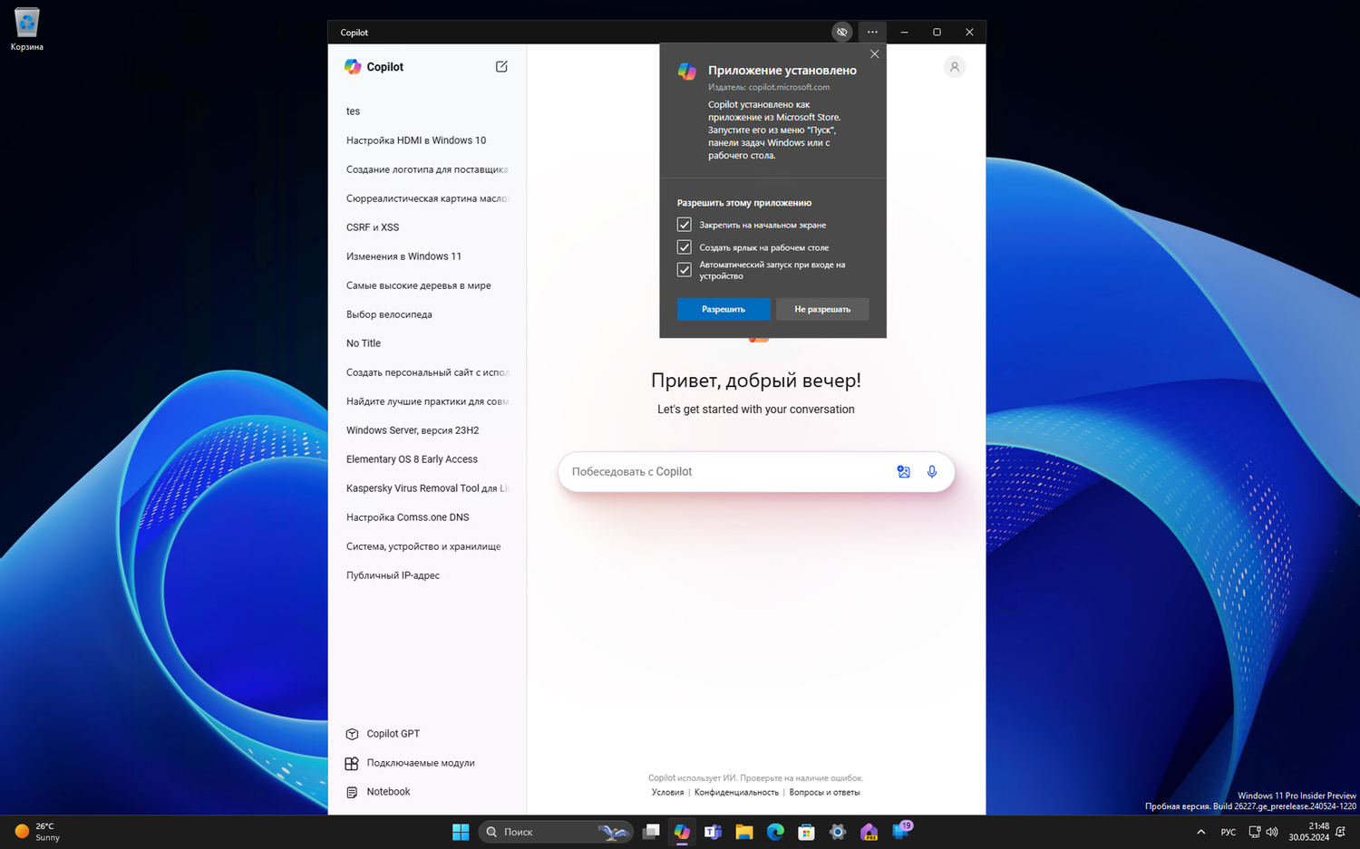 - В этом обновлении функция Copilot в Windows теперь представлена в виде приложения, закрепленного на панели задач. Это позволяет пользователям получать преимущества традиционного приложения, включая возможность изменения размера, перемещения и прикрепления окна, что было важным отзывом пользователей во время предварительного просмотра Copilot в Windows. Такой подход позволяет Microsoft более гибко разрабатывать и оптимизировать опыт на основе отзывов пользователей.