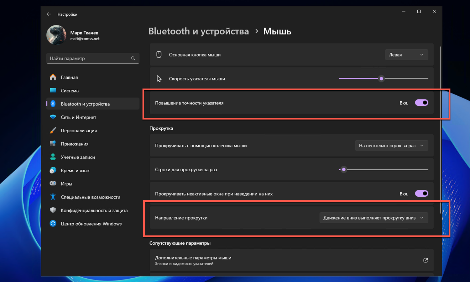Затем перейдите в «Параметры» > Bluetooth и устройства > Мышь, чтобы воспользоваться новыми параметрами.