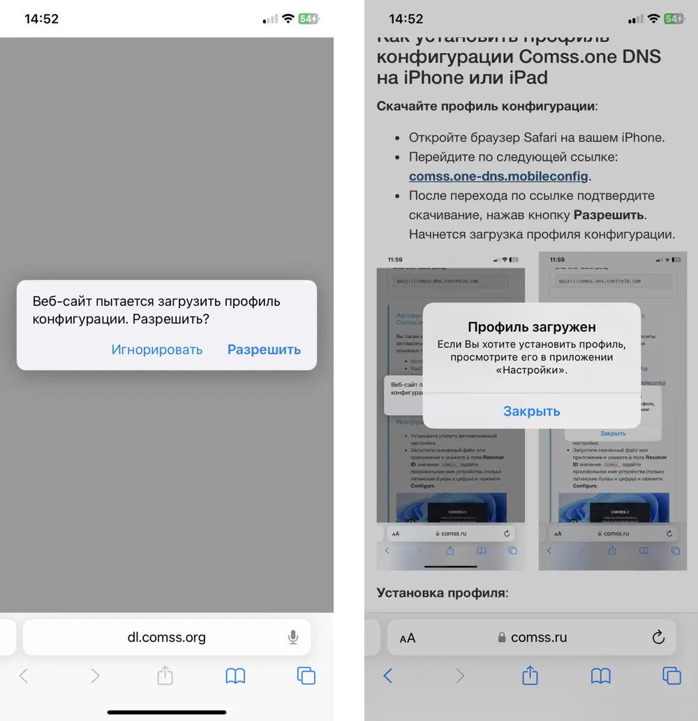 - Перейдите на страницу с инструкцией по настройке DNS от Comss.one: Как установить Comss.one DNS на iPhone с помощью профиля конфигурации .mobileconfig.