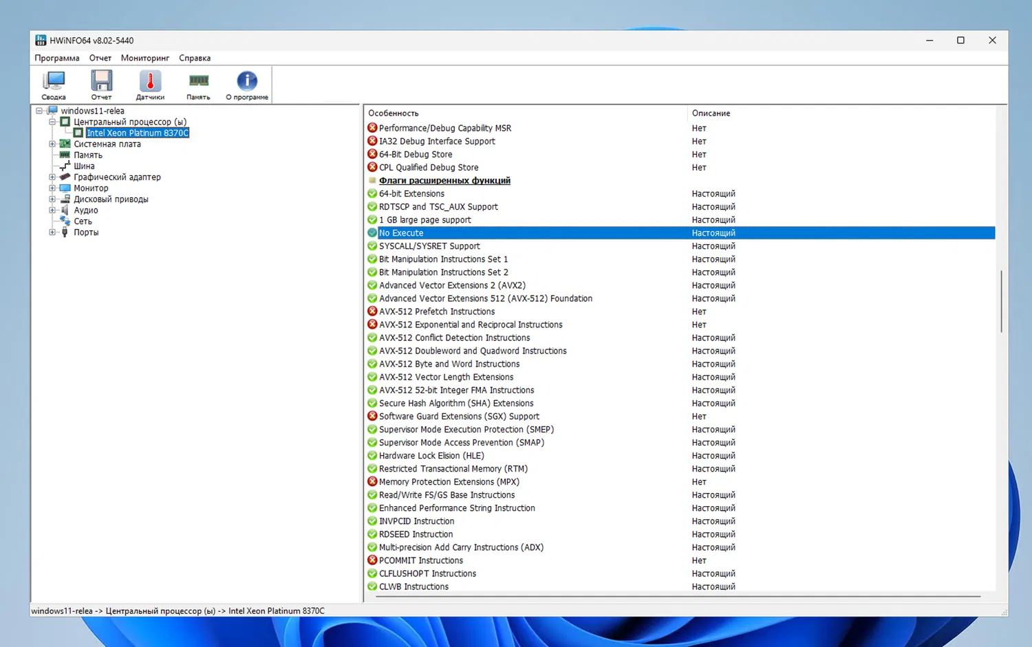 В главном окне HWiNFO перейдите в раздел Центральные процессор(ы), выберите ваш процессор, и вы должны увидеть Physical Address Extension в разделе Флаги стандартных функций и No Execute в разделе Флаги расширенных функций, отмеченных как Настоящий (Present). (В случае Intel может использоваться обозначение Execute Disable bit).
