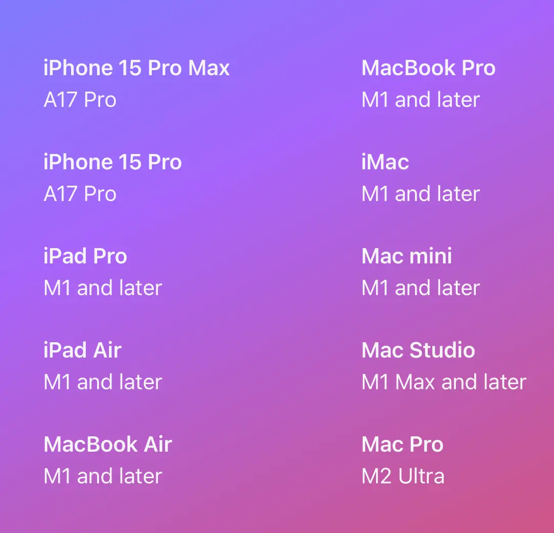 ИИ-функции будут доступны на iPhone 15 Pro и 15 Pro Max, а также на iPad и других устройствах с чипами M1 и более новыми. Apple Intelligence станет доступна в iOS 18, iPadOS 18 и macOS Sequoia летом 2024 года на английском языке для пользователей в США. Позже компания планирует добавить поддержку других языков и регионов.