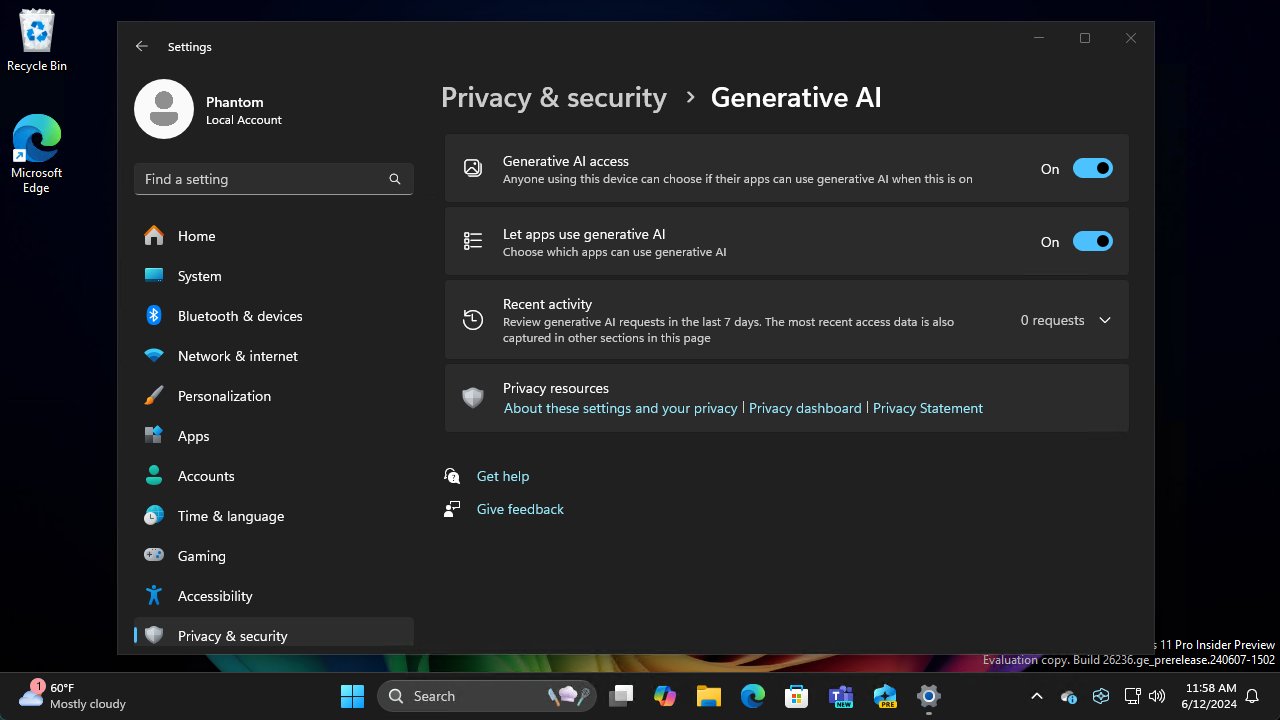 Также обнаружена новая страница в разделе «Конфиденциальность и защита» в приложении «Параметры». Она используется для управления доступом к функциям генеративного ИИ и просмотра недавней активности — можно увидеть запросы генеративного ИИ за последние семь дней.