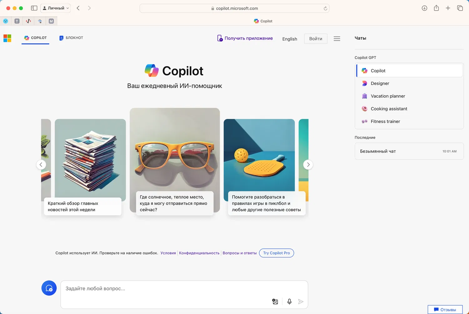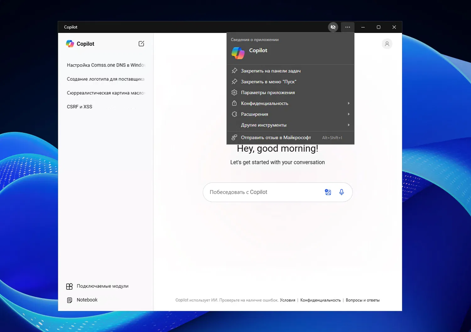 Однако Copilot не стал нативным приложением для Windows. Вместо этого это веб-приложение, которое система устанавливает с браузером Microsoft Edge. Это тот самый чат-бот, к которому вы можете получить доступ с copilot.microsoft.com.