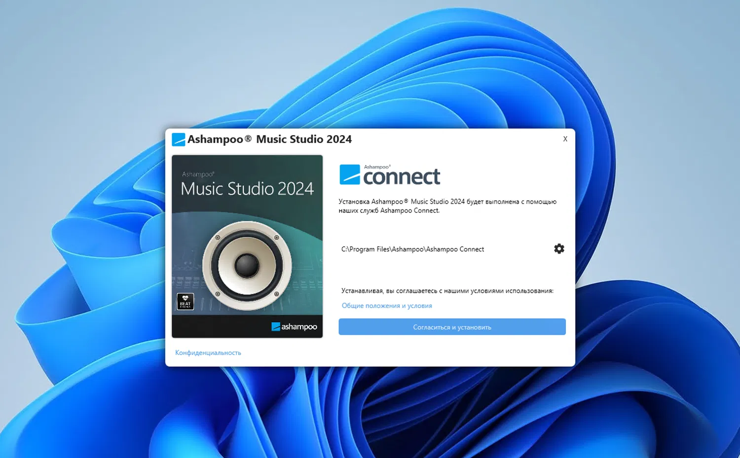 4. Далее в Ashampoo Connect для Ashampoo Music Studio 2024 нажмите Установить, чтобы установить программу на ваш компьютер.