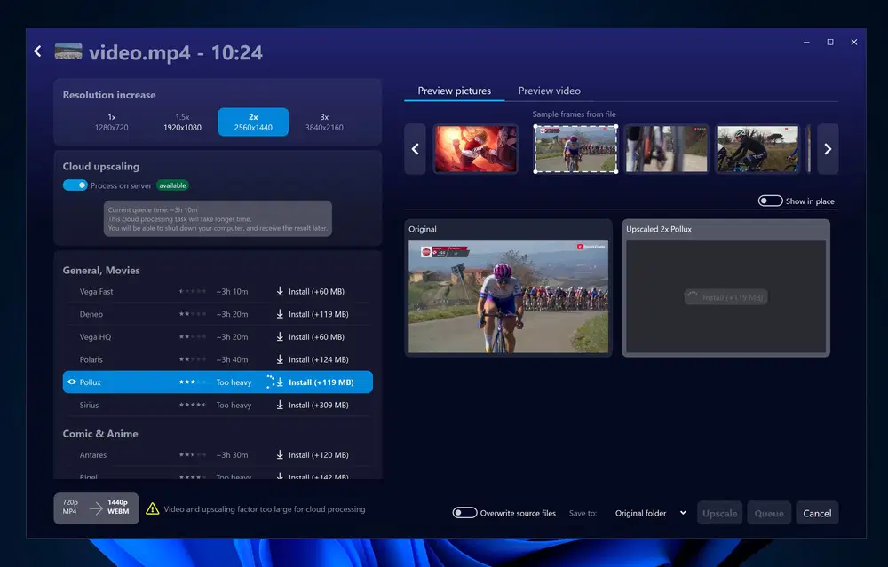 - Функциональные ограничения: В отличие от полной версии, которая предлагает широкий спектр ИИ-моделей и возможностей улучшения видео, SE-версия может иметь ограничения по доступным функциям и моделям AI. Например, в SE-версии пользователи столкнутся с ограничениями в выборе методов улучшения видео, с некоторыми доступными для загрузки моделями, такими как Vega Fast и Vega HQ, в то время как другие опции помечены как несовместимые.