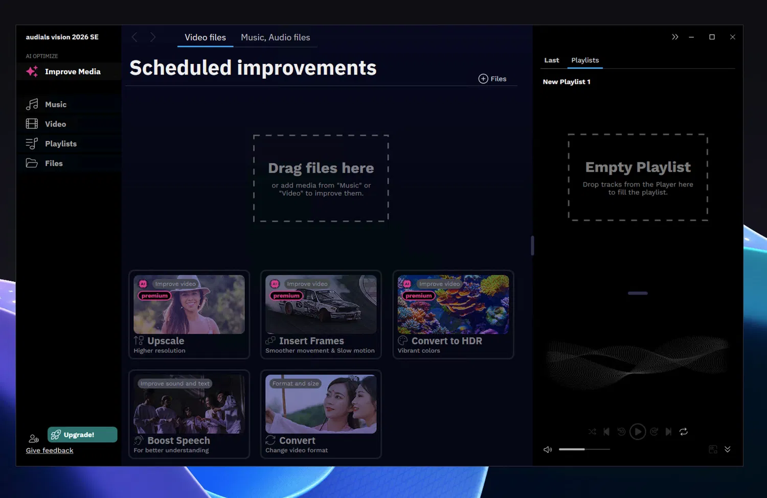 Одной из ключевых особенностей Audials Vision 2026 является расширенный выбор моделей AI, например, Vega Fast, Vega HQ, Polaris и Sirius, каждая из которых специализируется на определенных аспектах видео улучшения, таких как шумоподавление и улучшение разрешения. Программа также предлагает инструменты для создания замедленных видео и улучшения динамического диапазона цветов.