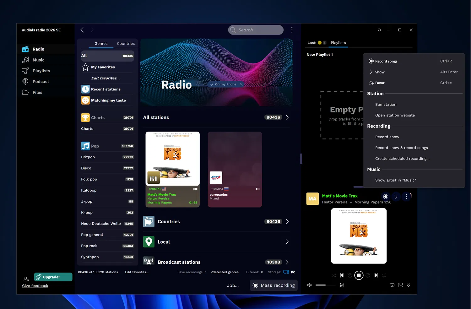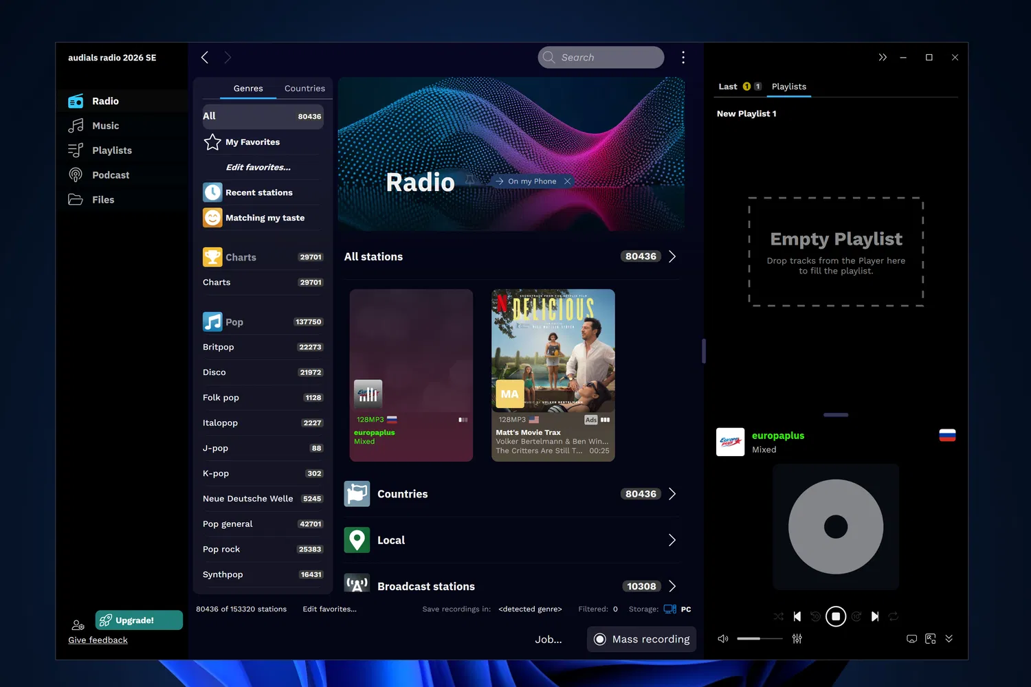 Программа Audials Radio 2026 представляет собой мощное решение для записи радио и подкастов, предлагая пользователям обширный выбор станций и жанров музыки со всего мира. Эта версия оснащена улучшенным интерфейсом и расширенными функциями для более комфортной и качественной записи.