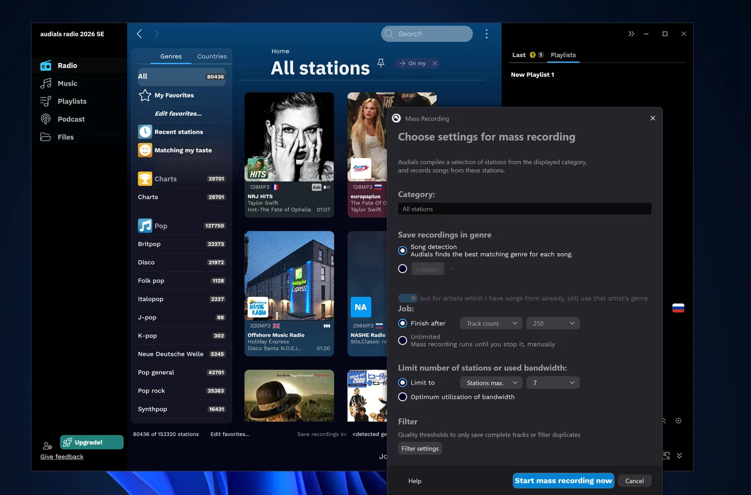 Audials Radio 2026 позволяет одновременно записывать трансляции с до 100 радиостанций, что дает возможность быстро создать обширные музыкальные коллекции. Программа автоматически добавляет к каждой записи теги, обложки альбомов и тексты песен, облегчая организацию и управление вашей музыкальной библиотекой.