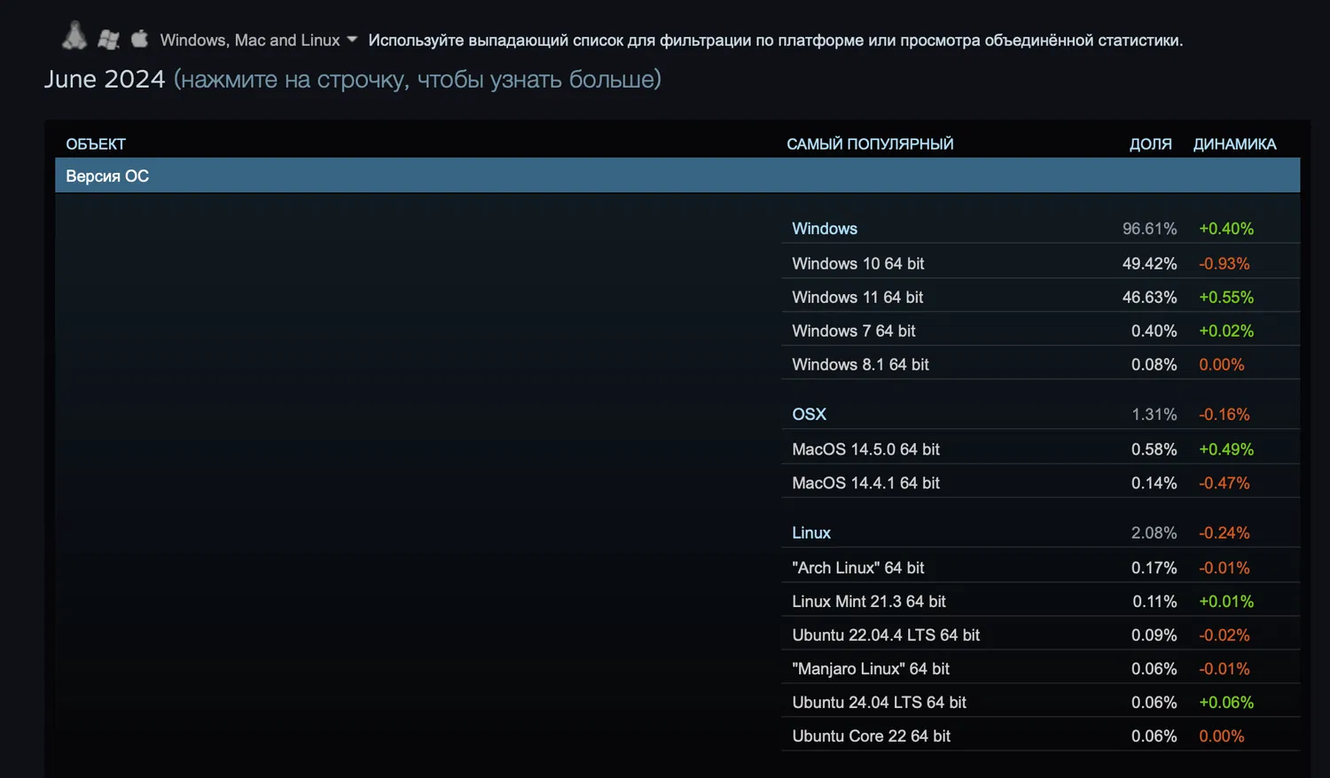Доля Windows 7 и Windows 8.1 довольно низки — 0,4% и 0,08% в случае 64-битных версий. В целом, 96,61% всех участников опроса сообщили, что используют Windows для игр на Steam (+0,40%). Linux занимает второе место с 2,08% (-0,24%), а macOS — третье с 1,31% (-0,16%).
