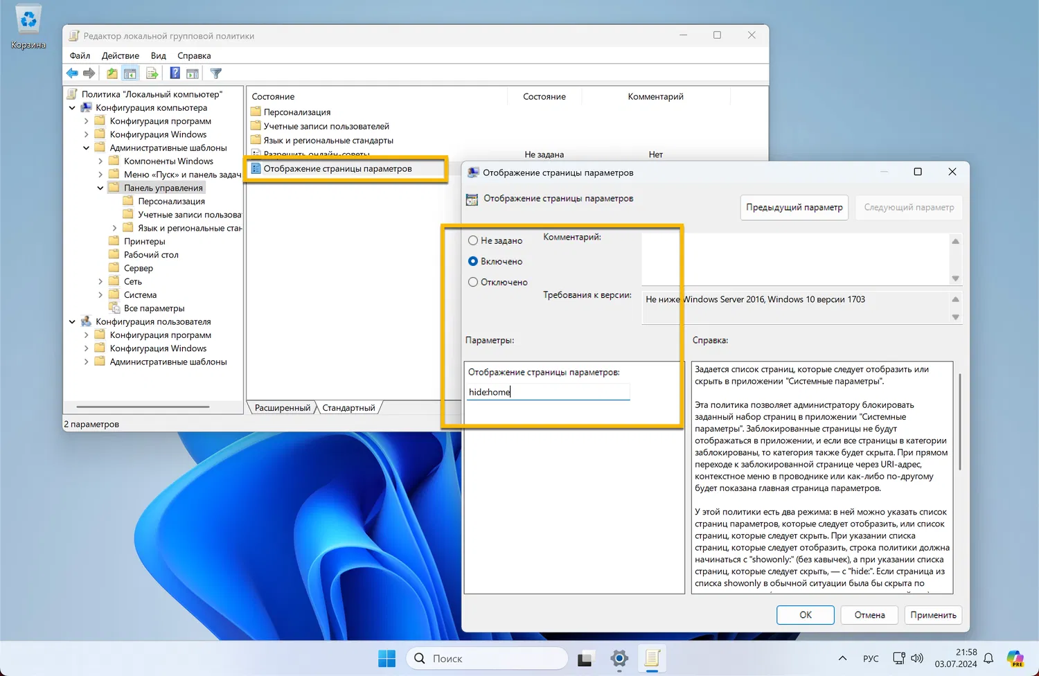 После перезапуска компьютера, страница «Главная» в приложении «Параметры» будет скрыта.
