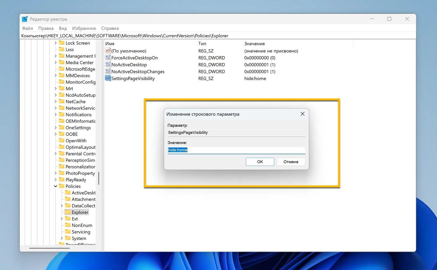 SettingsPageVisibility, измените его значение наhide:homeи нажмите Enter.