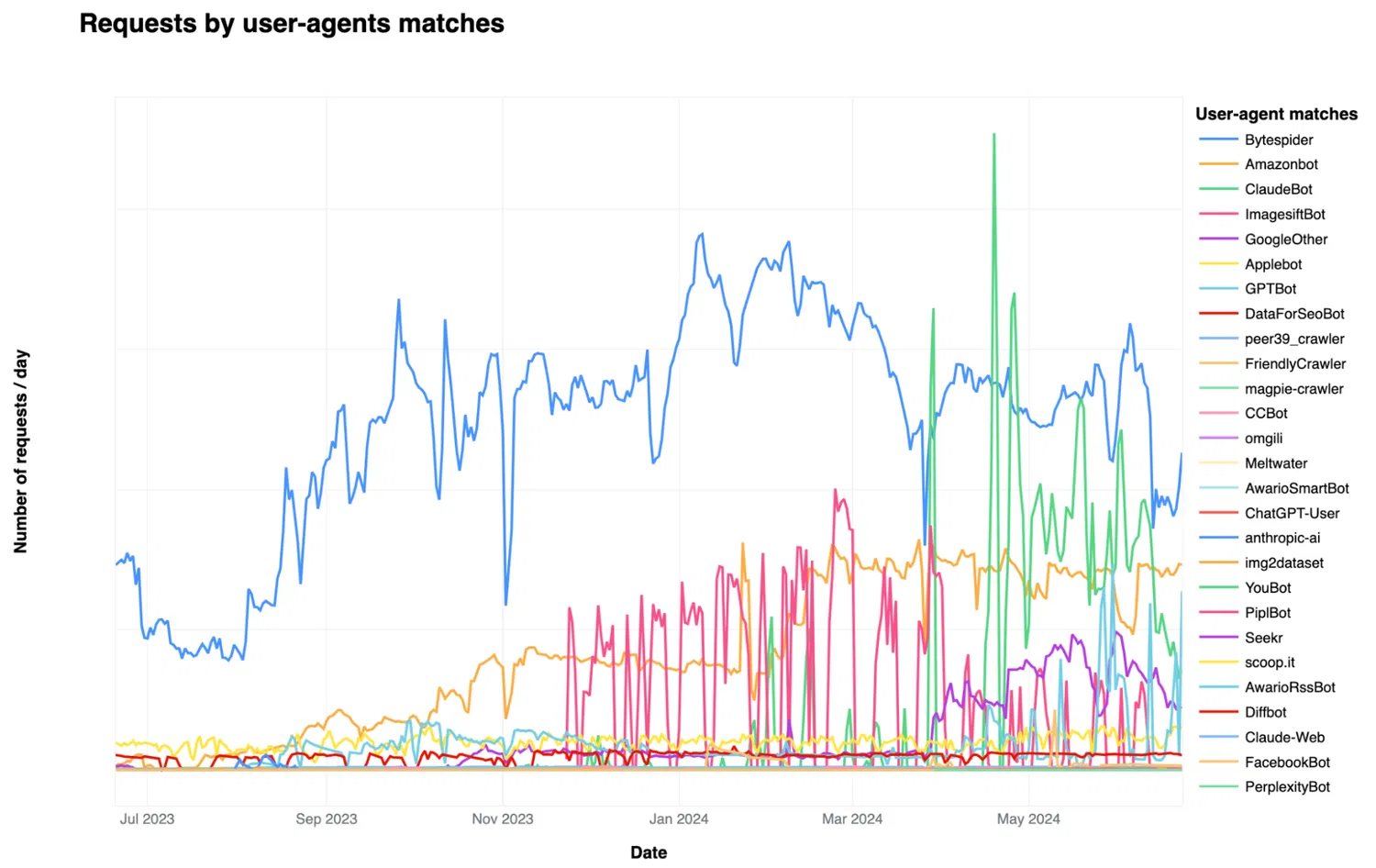 Согласно данным Cloudflare, самые популярные ИИ-боты, которые совершают наибольшее количество запросов, включают Bytespider, Amazonbot, ClaudeBot и GPTBot. Например, Bytespider, управляемый китайской компанией ByteDance, используется для сбора данных для языковых моделей, таких как Doubao, аналог ChatGPT. GPTBot от OpenAI также активно собирает данные для своих продуктов, таких как ChatGPT.