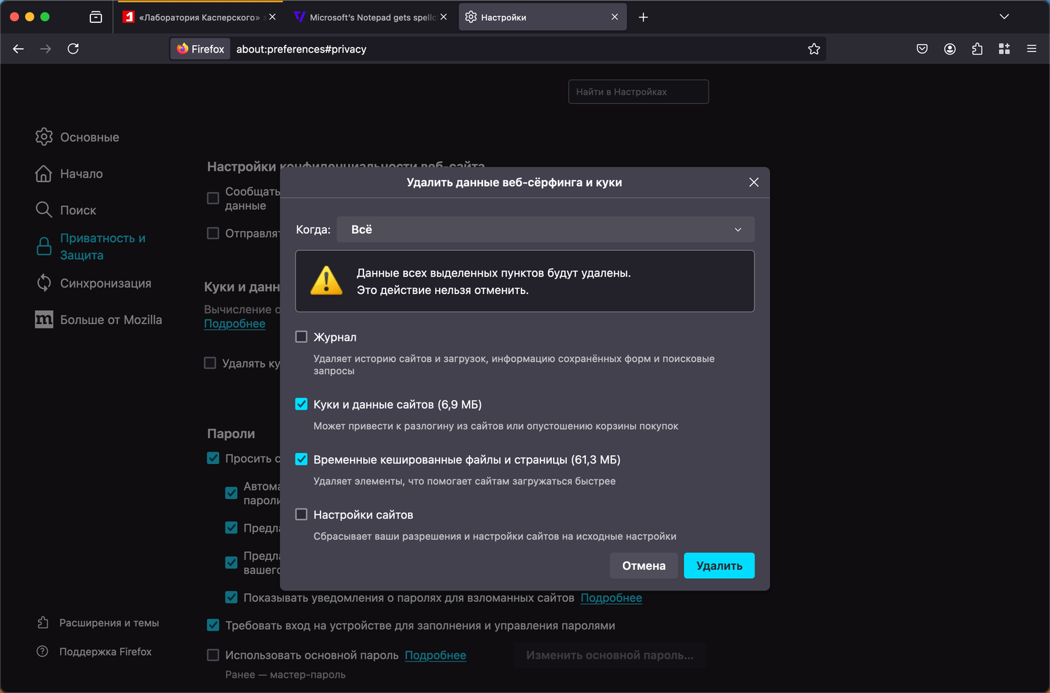 Изменено диалоговое окно «Удалить данные веб-серфинга и куки»