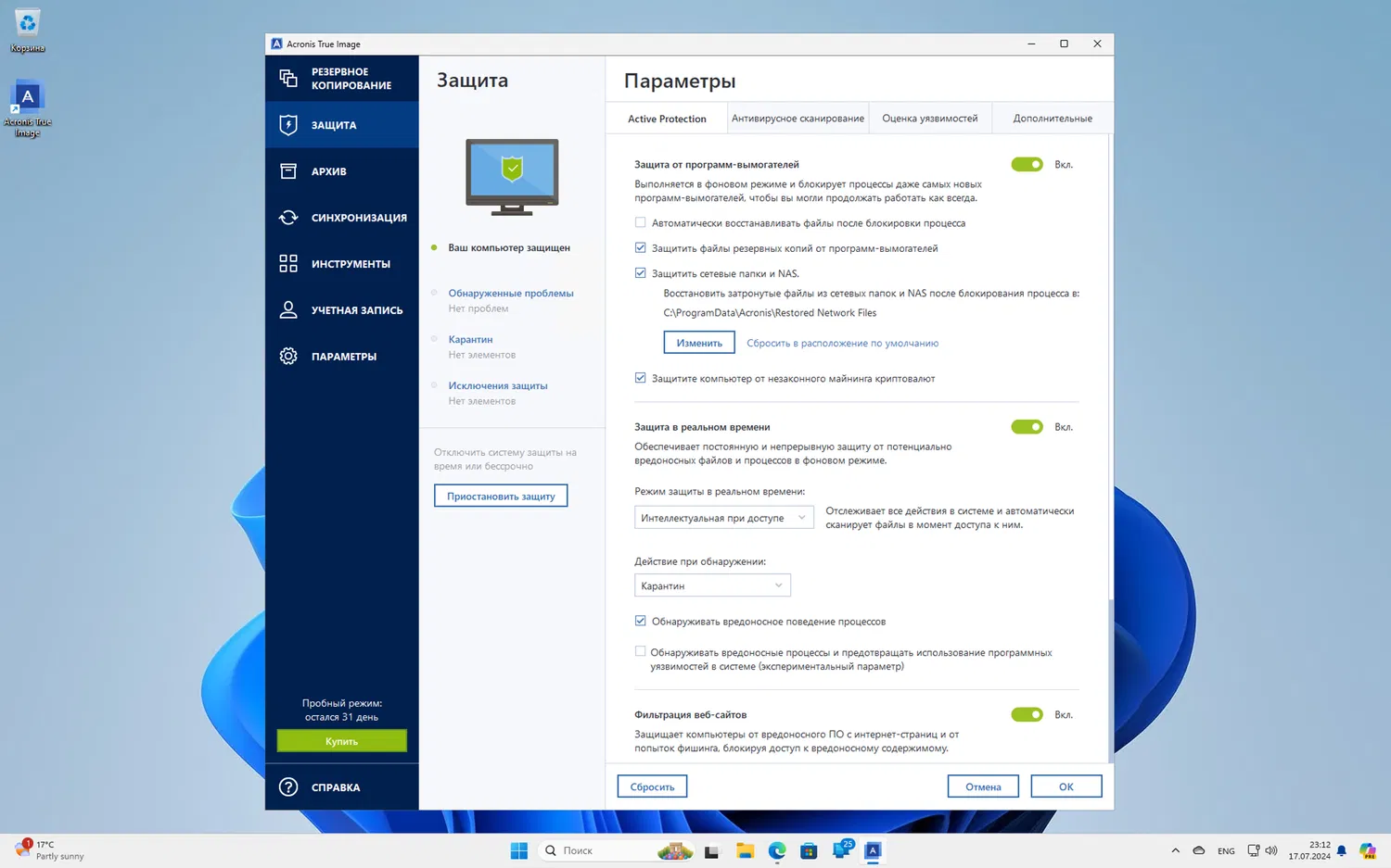Новая версия Acronis True Image включает не только улучшенные возможности резервного копирования, но и интегрированную киберзащиту. Среди новых функций — защита от программ-вымогателей и вредоносного ПО, а также антивирусная защита в реальном времени.
