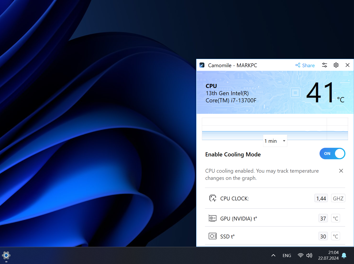 Функциональность у Camomile не очень широкая. Вы можете включить режим охлаждения и отключить его. Помимо этого, инструмент отображает график температуры и информацию о температуре других компонентов ПК.
