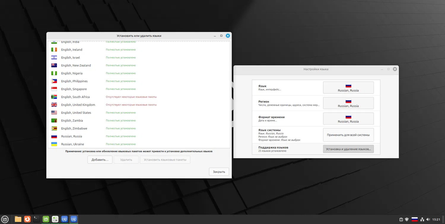 В Linux Mint 22 значительные улучшения были внесены в процесс локализации. После установки удаляются пакеты для языков, кроме английского и выбранного вами языка. Это значительно уменьшает занимаемое дисковое пространство.