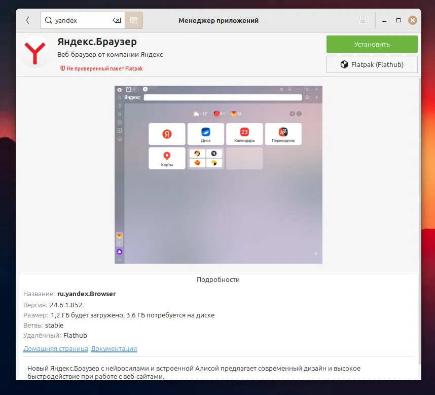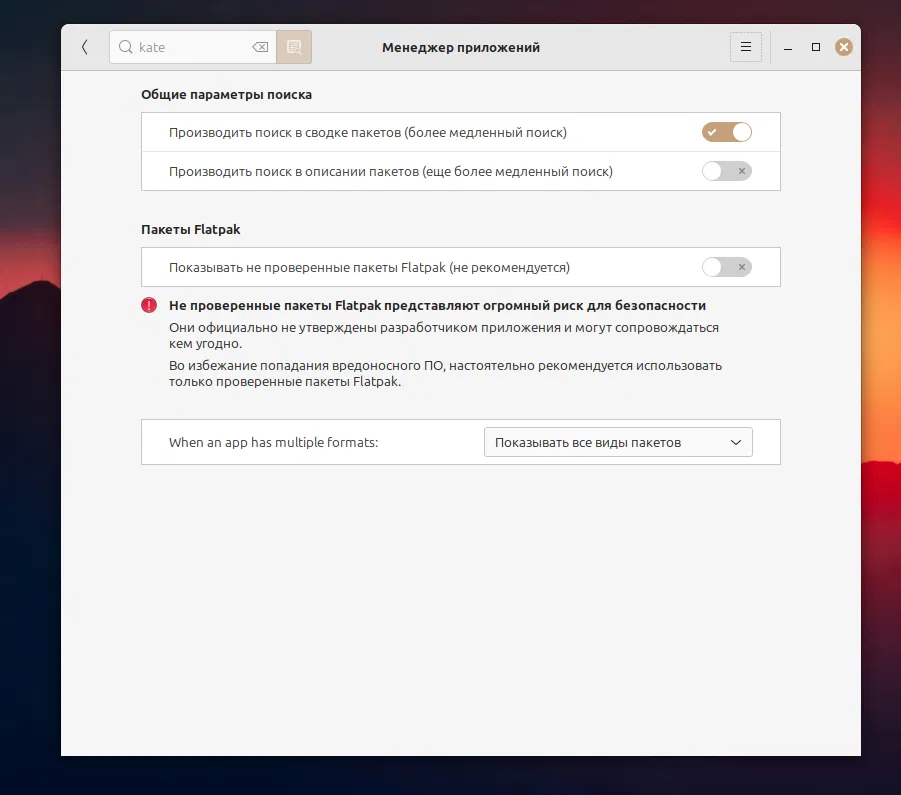 Теперь верифицированные Flatpaks отображают имя своего поддерживающего. Неверифицированные Flatpaks по умолчанию отключены, и пользователю показывается предупреждение о связанных с ними рисках безопасности. Если они включены, такие Flatpaks четко обозначены как неверифицированные. Обратите внимание, что неверифицированные Flatpaks также не имеют отзывов и не имеют оценки.