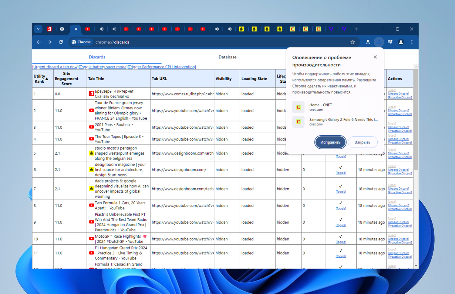 Отобразить уведомление можно принудительно — откройте раздел chrome://discards и нажмите на опцию Trigger Performance CPU intervention. Уведомление о предупреждении о производительности появится в правом верхнем углу и укажет на проблемные вкладки.