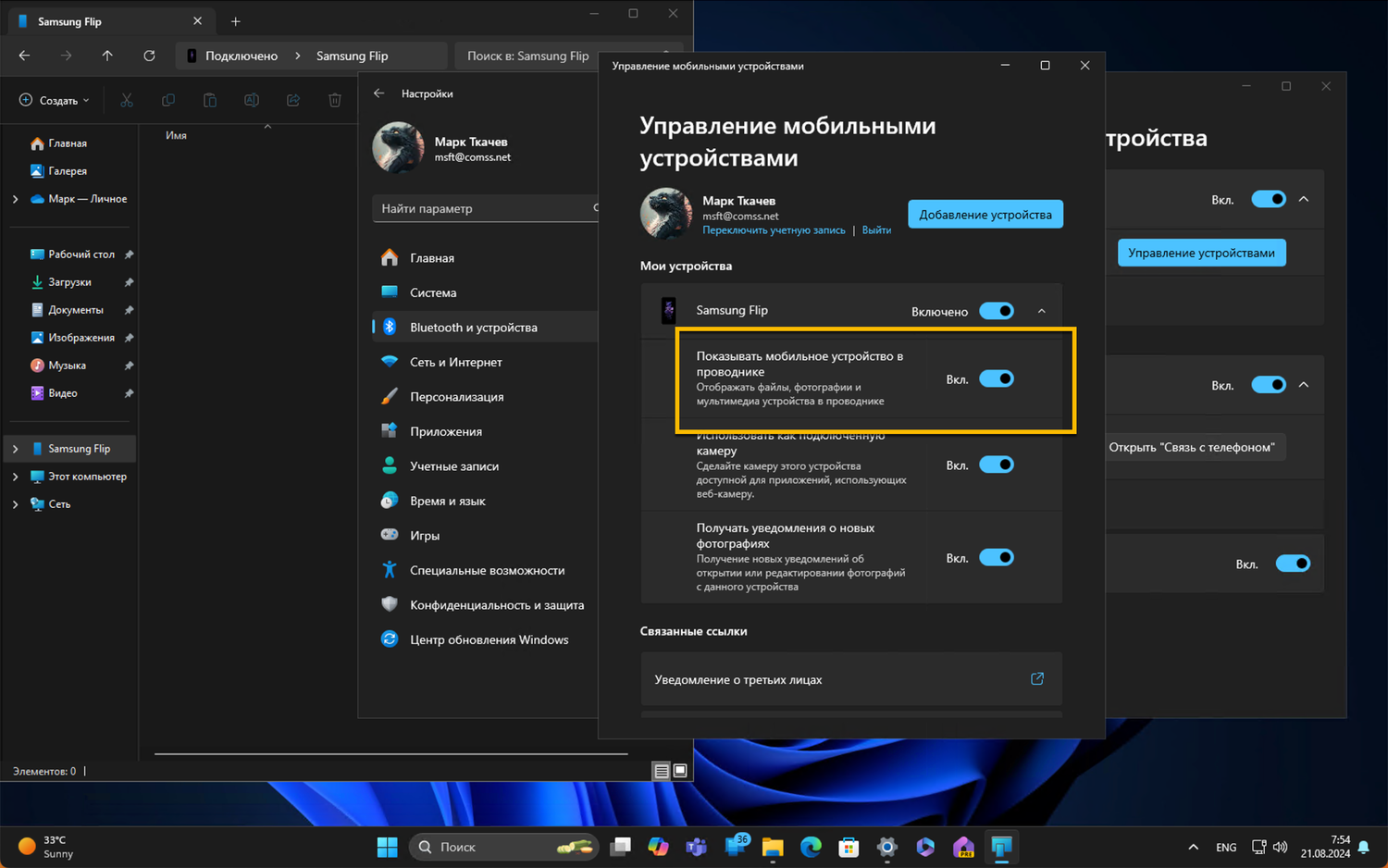 Чтобы включить эту функцию, перейдите в приложение «Параметры» > Bluetooth и устройства > Мобильные устройства и выберите Управление устройствами и разрешите вашему ПК доступ к телефону Android (включите опцию Показывать мобильное устройств в проводнике). Затем вы увидите переключатель для отображения файлов на телефоне в Проводнике. Если вы не видите переключатель, это означает, что эта функция еще не развернута для вас.