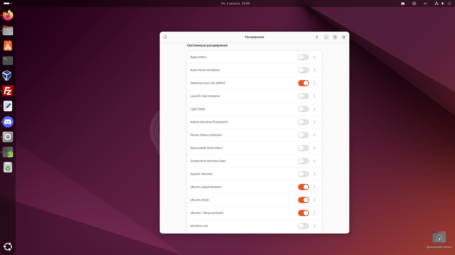 Как и другие дистрибутивы Linux, использующие GNOME Shell, Ubuntu не включает этот набор расширений в стандартную установку, но он доступен в их репозиториях. Для установки можно использовать команду sudo apt install gnome-shell-extensions.