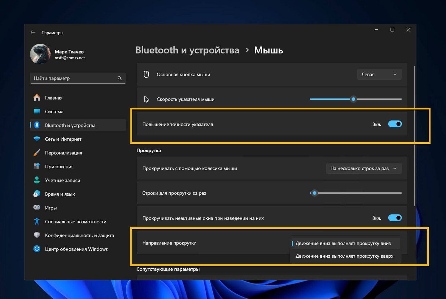 - Обновлены параметры в разделе Параметры > Bluetooth и устройства > Мышь: добавлена опция отключения улучшенной точности указателя мыши для тех, кто предпочитает ее не использовать, а также новая опция для изменения направления прокрутки мыши.