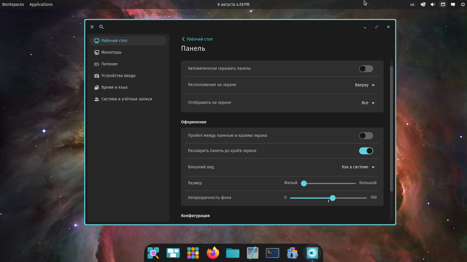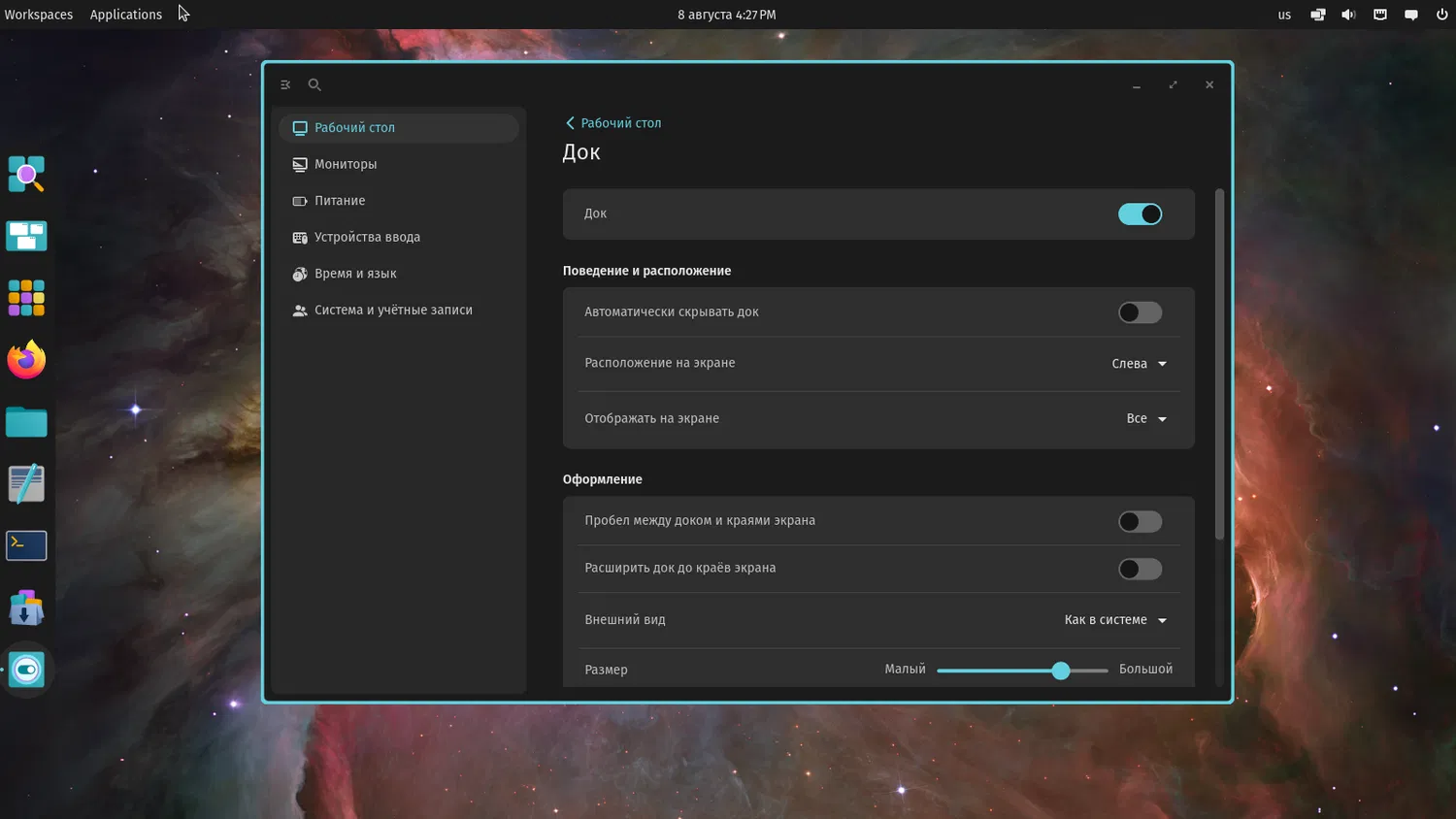 Вы можете изменить положение дока или панели, настроить их размер, прозрачность и внешний вид, включить автоскрытие или добавить апплеты.