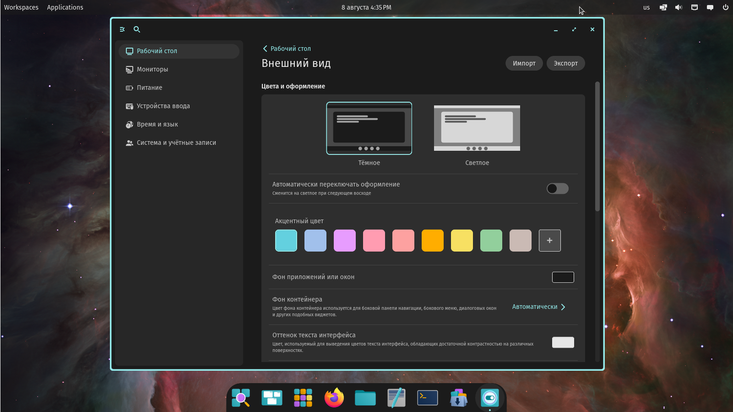 COSMIC предлагает высокий уровень кастомизации: можно легко переключаться между светлой и тёмной темами, выбирать акцентные цвета, изменять форму элементов рабочего стола и многое другое.
