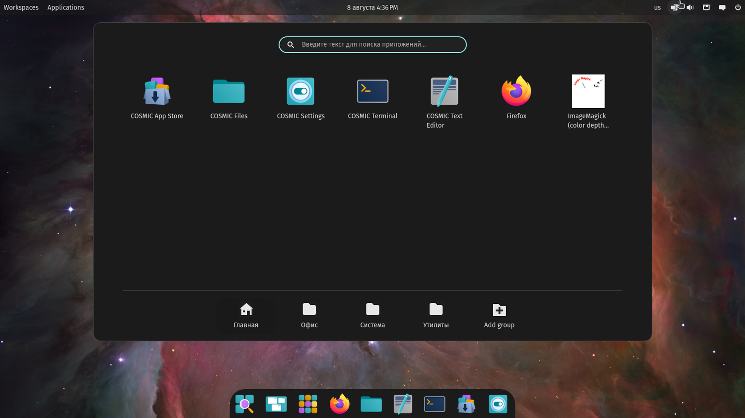 При входе в COSMIC вы сразу видите чистый и знакомый интерфейс. Все элементы находятся на привычных местах: док-панель внизу, панель сверху, переключатель рабочих столов в верхнем левом углу, а быстрые настройки и системный трэй — в верхнем правом углу.