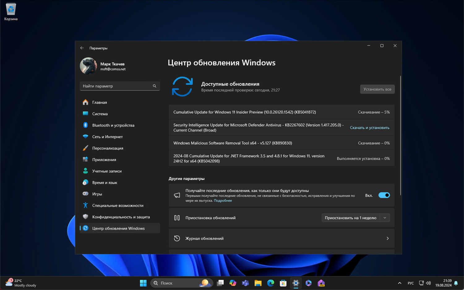 Перейдите в меню Параметры > Центр обновления Windows и нажмите Проверить наличие обновлений. Для завершения установки потребуется перезагрузка компьютера.