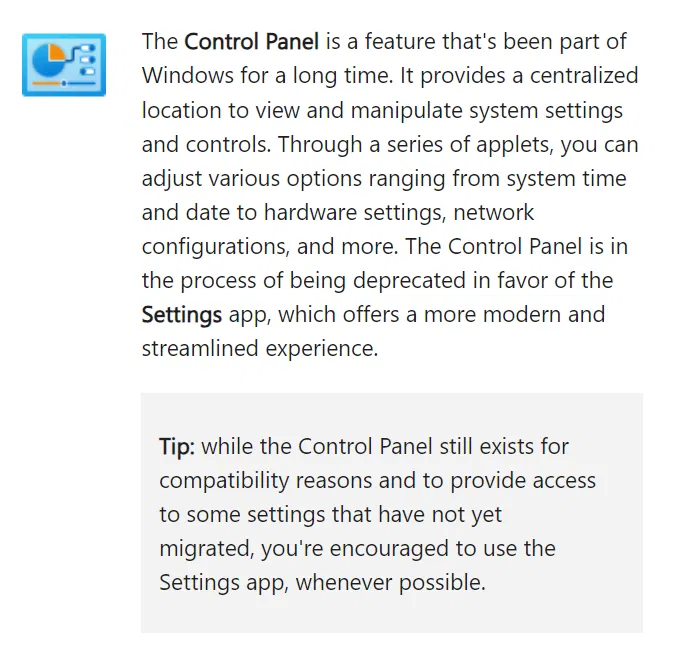 Этот абзац на самом деле не подтверждает окончательное удаление «Панели управления», а лишь указывает на постепенный переход к новому приложению «Параметры». Microsoft рекомендует пользователям начинать использовать «Параметры» вместо «Панели управления» там, где это возможно, подчеркивая, что старая панель настроек все еще доступна для задач, которые не были полностью перенесены в новый интерфейс. Таким образом, компания сигнализирует о постепенной миграции к современному интерфейсу, но не о немедленном и полном отказе от «Панели управления».