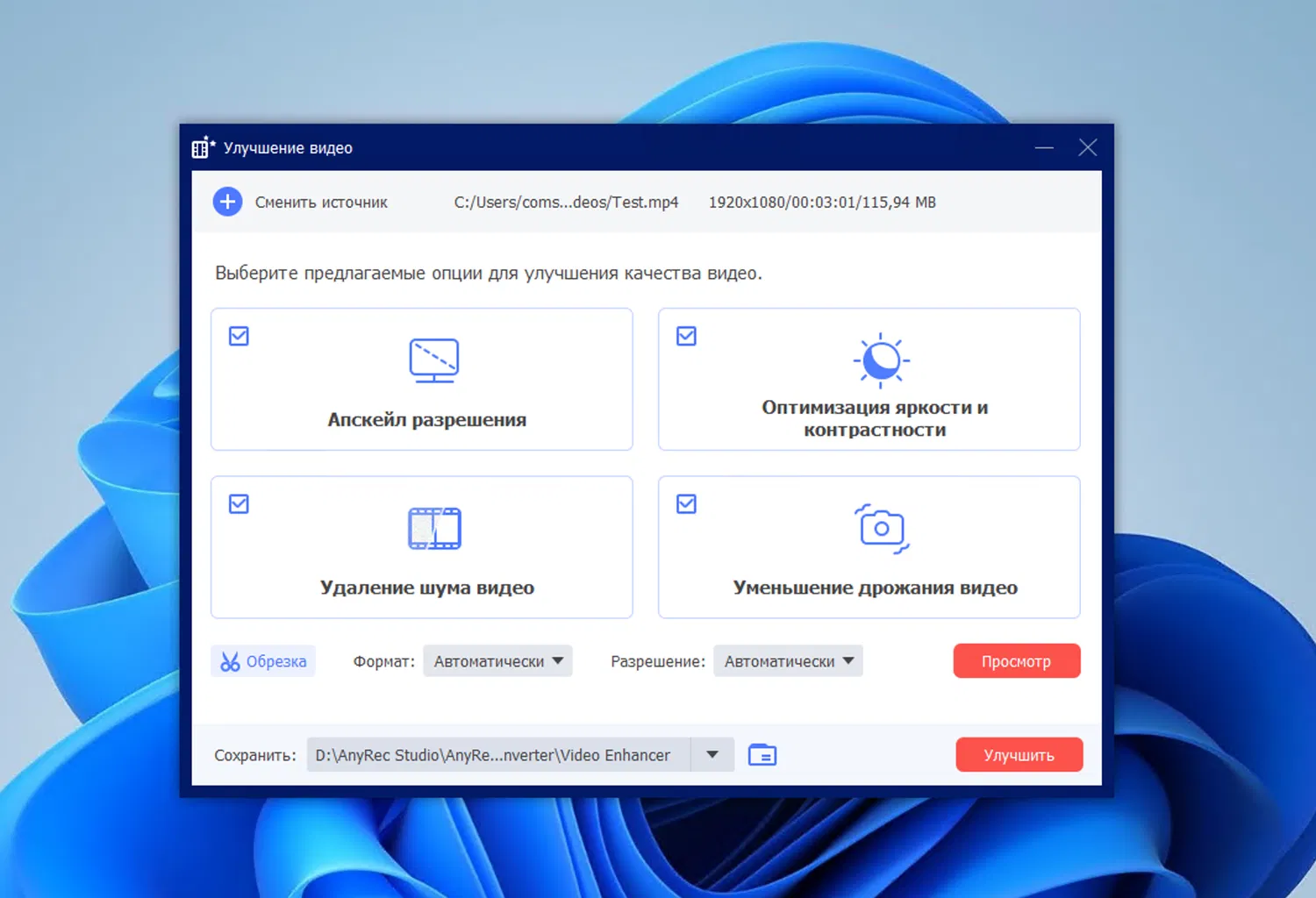 - Улучшение качества видео с помощью ИИ: AnyRec Video Converter оснащен инструментами, основанными на технологии искусственного интеллекта, которые позволяют улучшать качество видео, повышать разрешение, оптимизировать яркость и контрастность, устранять шумы и минимизировать тряску изображения.
