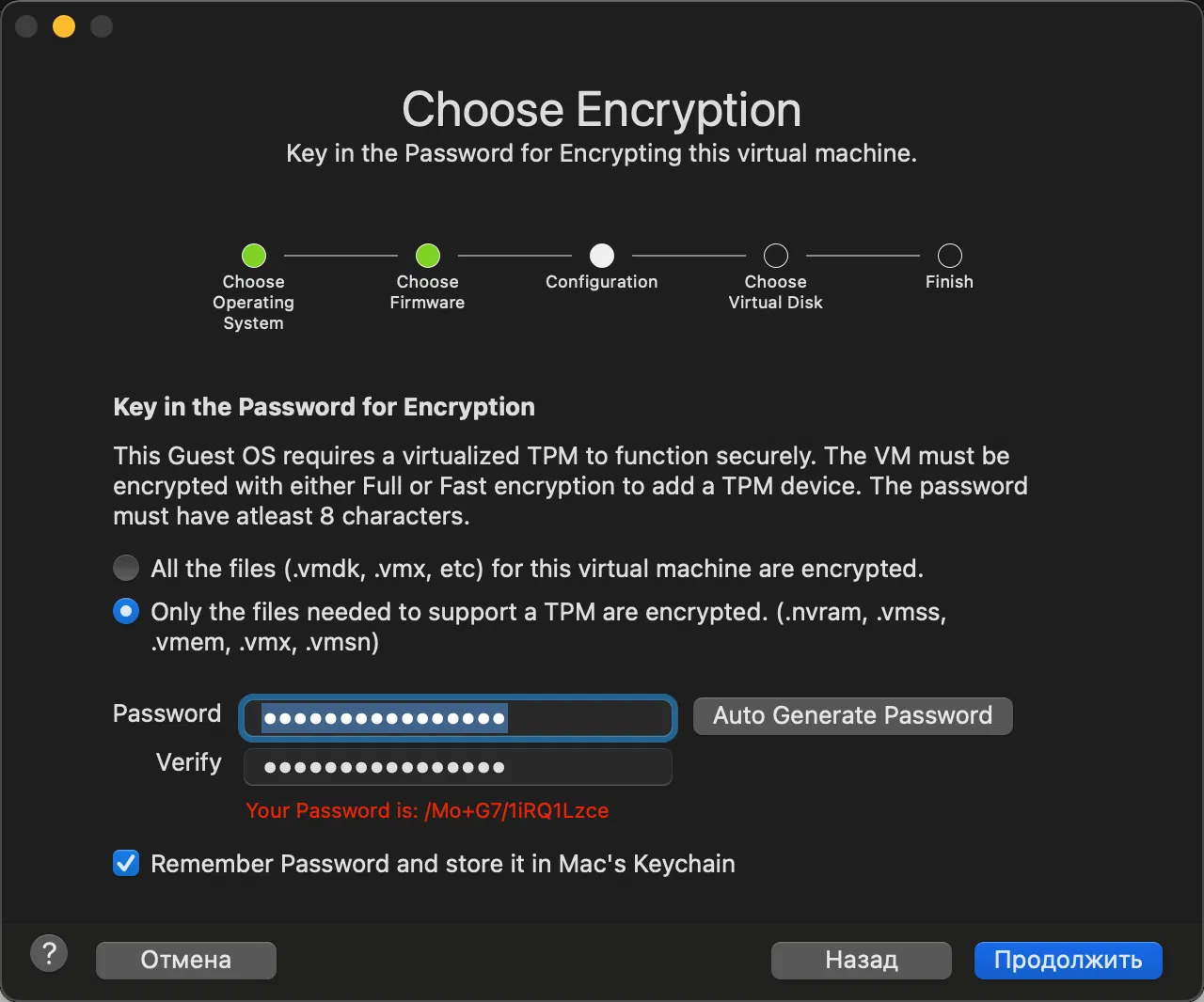 - Сгенерируйте ключ шифрования. Это необходимо для корректной работы Windows 11. Нажмите Auto Generate Password (Автоматически сгенерировать пароль) и убедитесь, что опция Remember Password and store it in Mac's Keychain (Запомнить пароль и сохранить его в Связке ключей Mac) активирована.