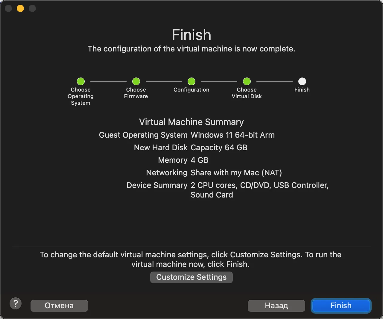 - На странице завершения настройки выберите Customize Settings (Настроить параметры) и нажмите Сохранить для сохранения конфигурации виртуальной машины. Вы можете выбрать место для хранения файла конфигурации на внешнем диске, если хотите сэкономить место на основном диске Mac.