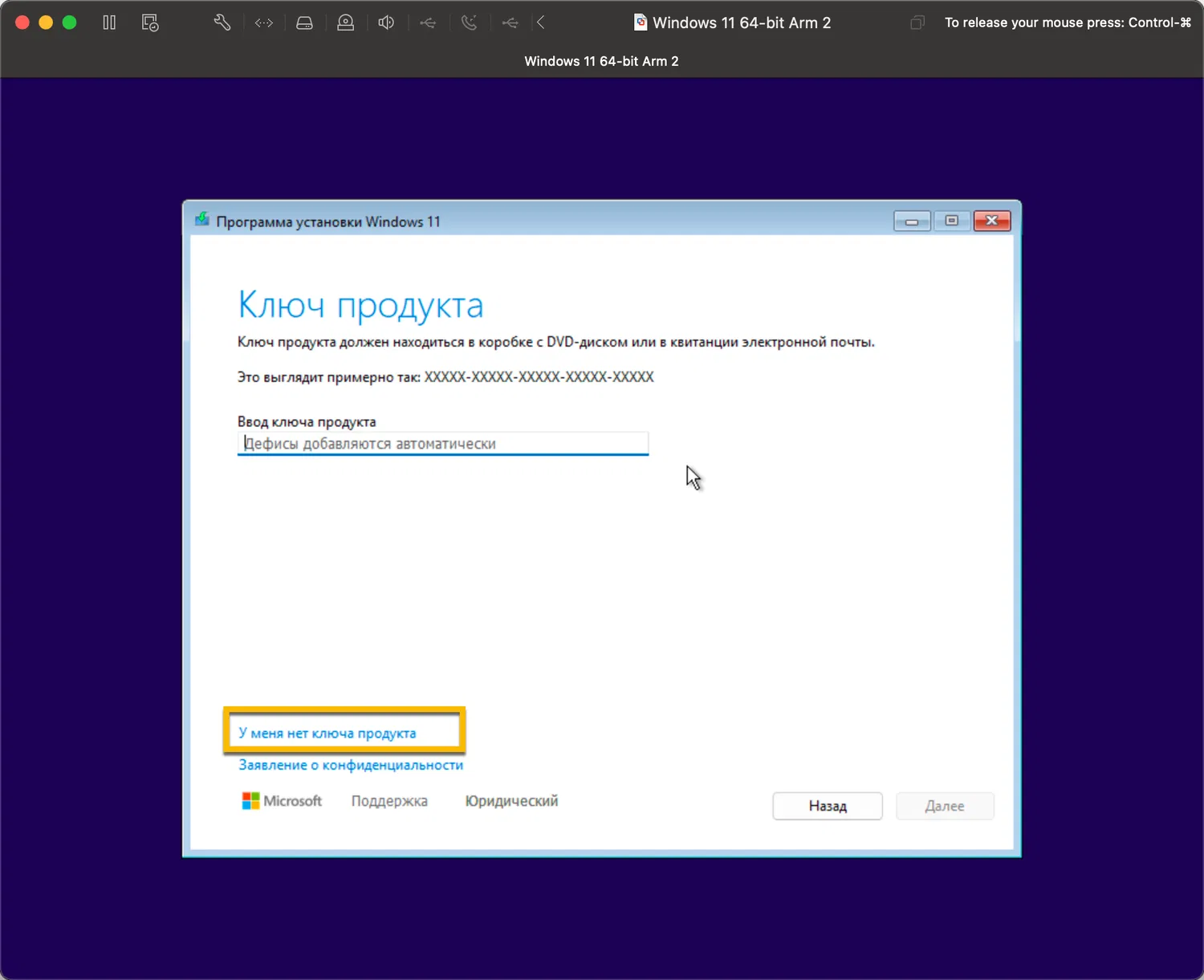 - На экране активации Windows выберите У меня нет ключа продукта (I don’t have a product key). Или введите лицензионный ключ, если он имеется.
