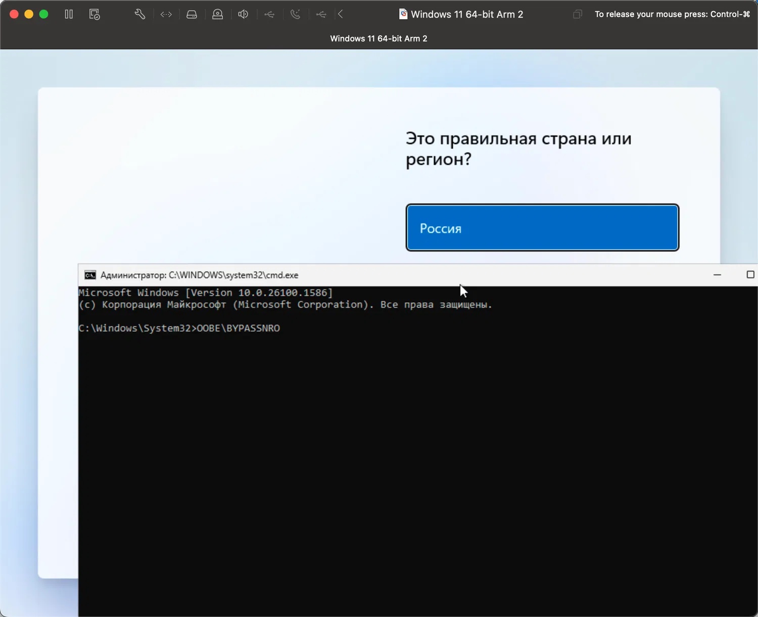 OOBE\BYPASSNROи нажмите Enter. Windows перезагрузится и позволит вам продолжить настройку без входа в учетную запись Microsoft.