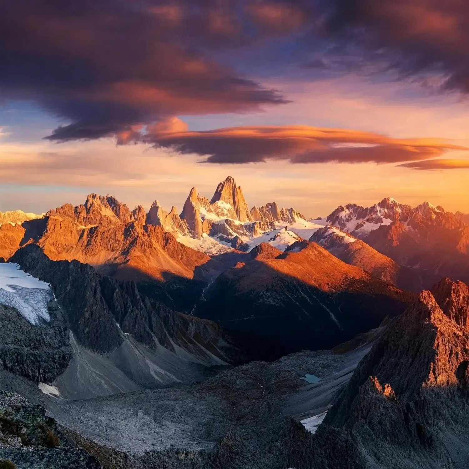 - Фотореалистичный вид горного пейзажа с заснеженными вершинами и закатным солнцем.