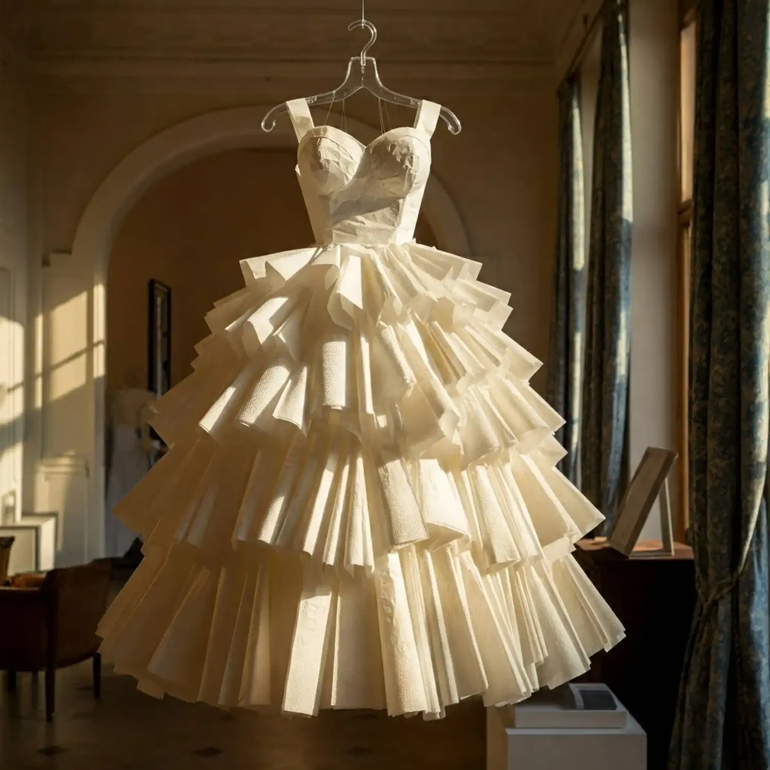 - Изображение вечернего платья, сделанного из бумажных салфеток в элегантном шоуруме.