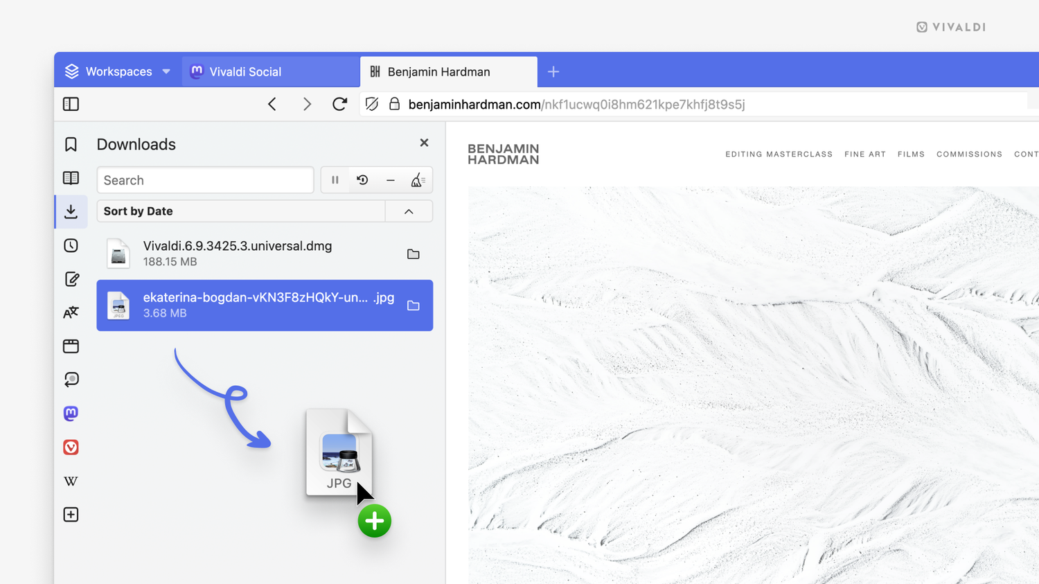 Новая функция перетаскивания файлов из панели загрузок призвана повысить продуктивность. В Vivaldi 6.9 вы можете перетаскивать файлы прямо из панели загрузок на рабочий стол, в папку или даже в электронное письмо или документ. Вы также можете выделить несколько файлов в панели загрузок для одновременного перемещения.