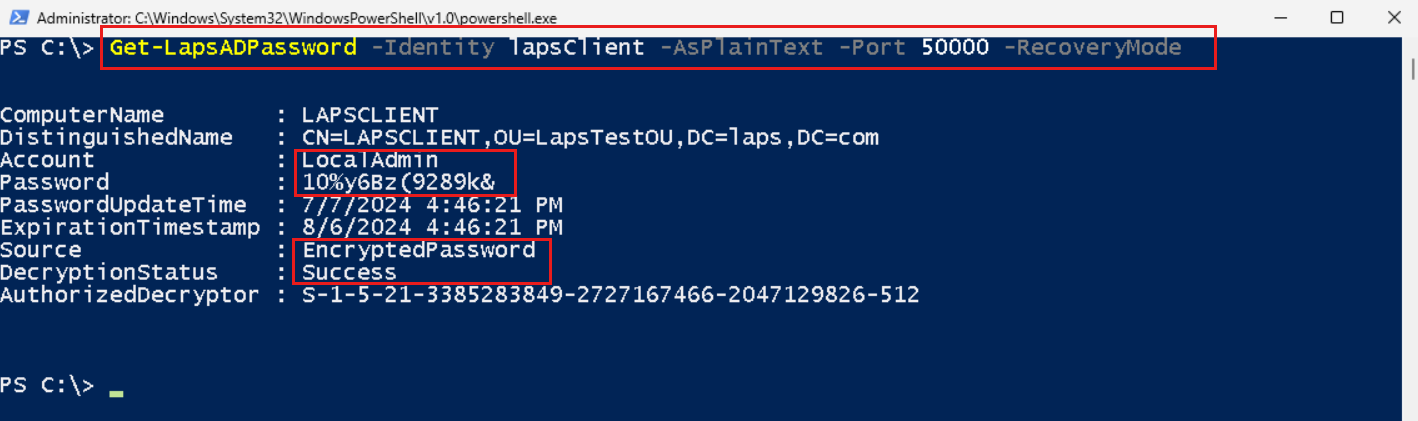 Это улучшение реализовано в существующем командлете PowerShell Get-LapsADPassword. При одновременном указании параметров -Port и -RecoveryMode любые извлеченные пароли будут автоматически расшифрованы в локальной операции с использованием ключей расшифровки, найденных в обозревателе снимков.