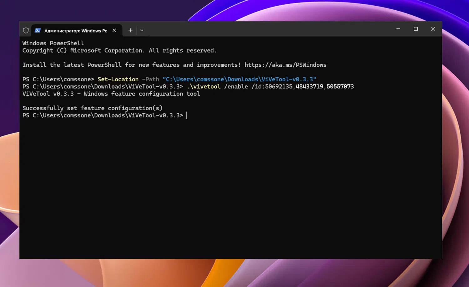 Примечание: В примерах используются команды в Терминале для профиля PowerShell . Если вы используете профиль Командная строка, замените начальную команду .\vivetool на vivetool.