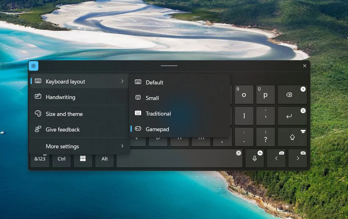 Клавиатура для геймпада в данный момент проходит тестирование на бета-канале Windows 11 и включает «ускорители кнопок» (button accelerators), позволяющие использовать кнопку X для удаления символов, кнопку Y для пробела и кнопку меню на контроллере Xbox для нажатия Enter. Клавиши на новой клавиатуре выровнены по вертикали, что упрощает набор текста с помощью контроллера.